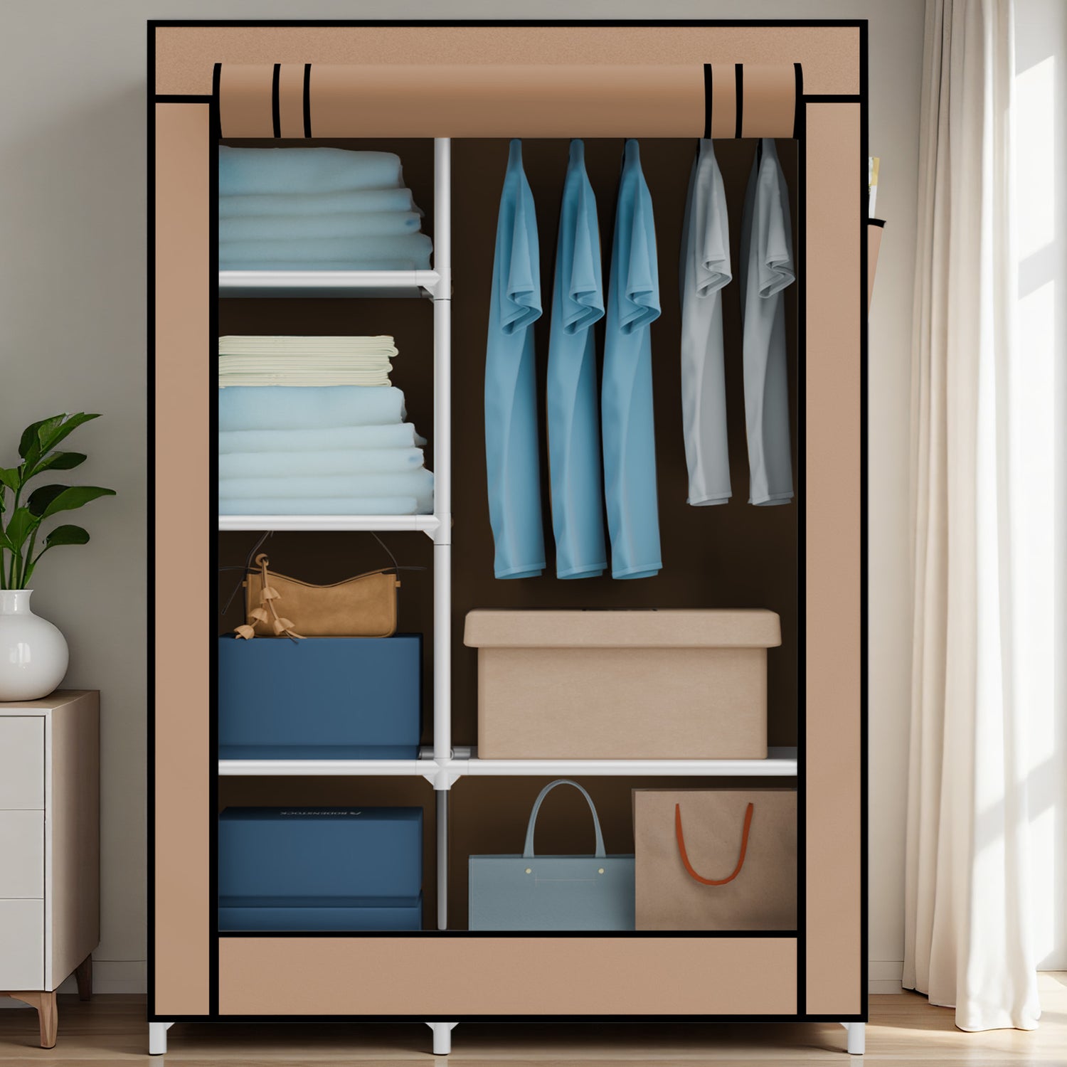 This freestanding portable wardrobe measures 106cm W x 44cm D x 170cm H (41.7" x 17.3" x 66.9"), perfectly suited for bedrooms, corridors, garages, apartments or dorms where space is limited. It features a spacious hanging area for coats/dresses, multiple reinforced shelves for folded clothes, shoes, bags or boxes, plus handy side pockets. Built with thickened 12mm steel pipes, reinforced PVC connectors and durable non-woven breathable fabric cover with full 360° wrapping and smooth zipper for dust protection. Modern beige design blends seamlessly. Tool-free assembly in minutes. Reliable stability with anti-tip features. Backed by 7-year warranty and 365-day satisfaction guarantee.