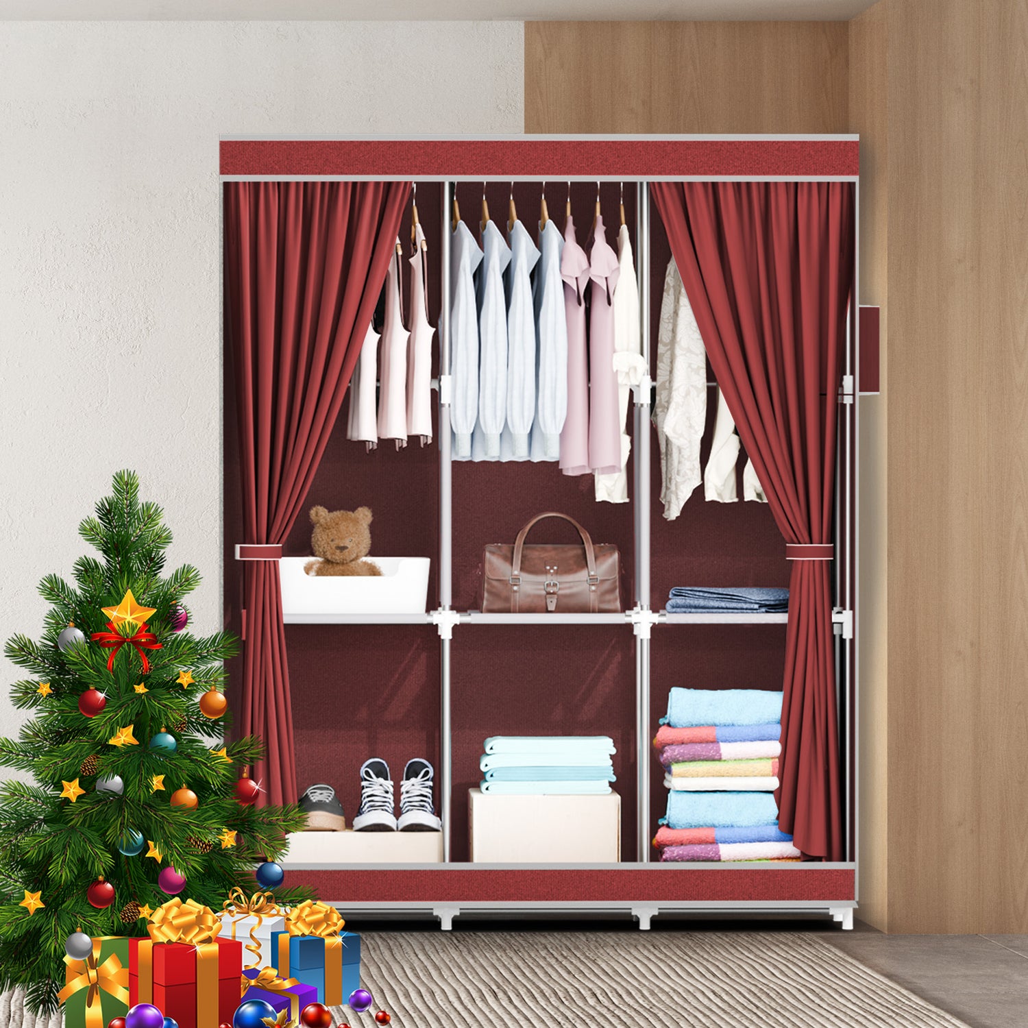 This portable fabric wardrobe measures 51" W x 17" D x 67" H (130x43x170cm), fitting perfectly in bedrooms, dorms, apartments or small spaces. It offers a large hanging area for coats, dresses and shirts plus three bottom storage shelves for folded clothes, shoes, bags or boxes. Built with strong steel tubes, reinforced plastic connectors and durable non-woven fabric cover, it ensures excellent stability (includes anti-tip kit for wall security). The zippered, curtain-style door with hook-and-loop fasteners protects against dust while maintaining a modern, neutral beige style that blends seamlessly. Tool-free assembly takes minutes. Enjoy reliable organization with our 7-year warranty and 365-day satisfaction guarantee.
